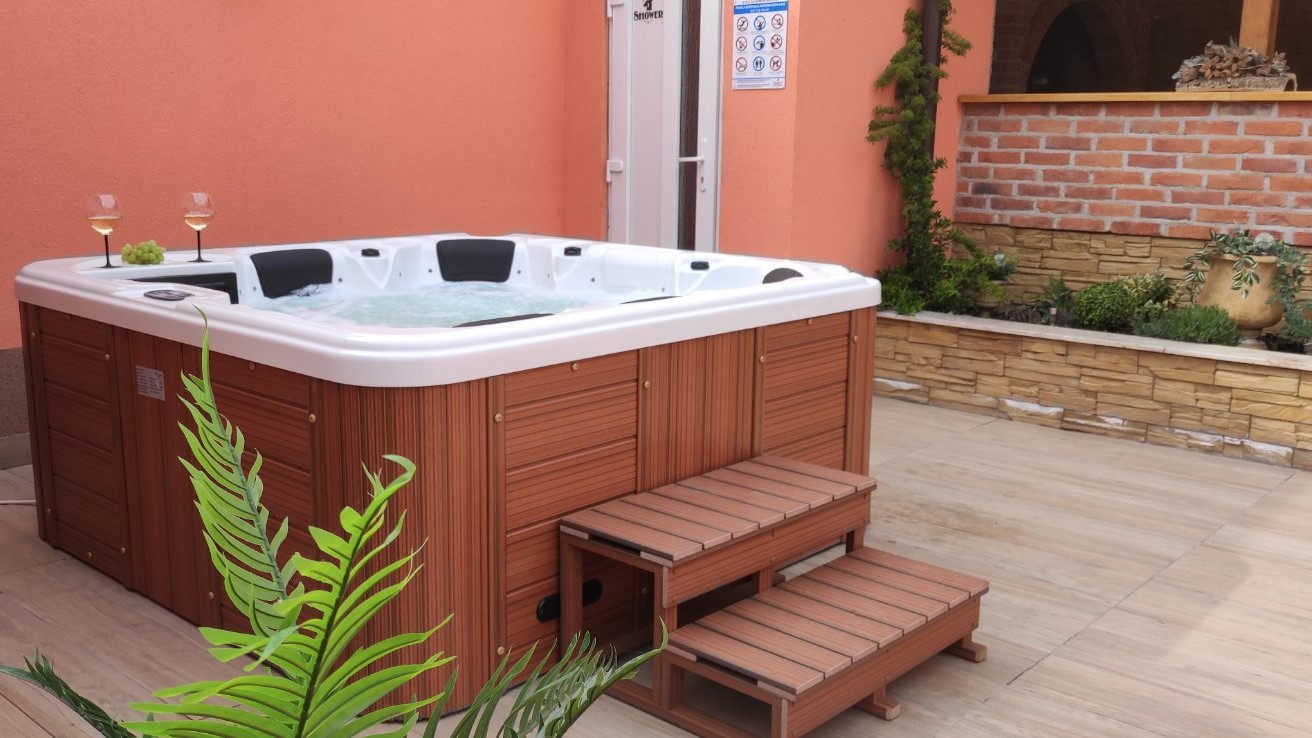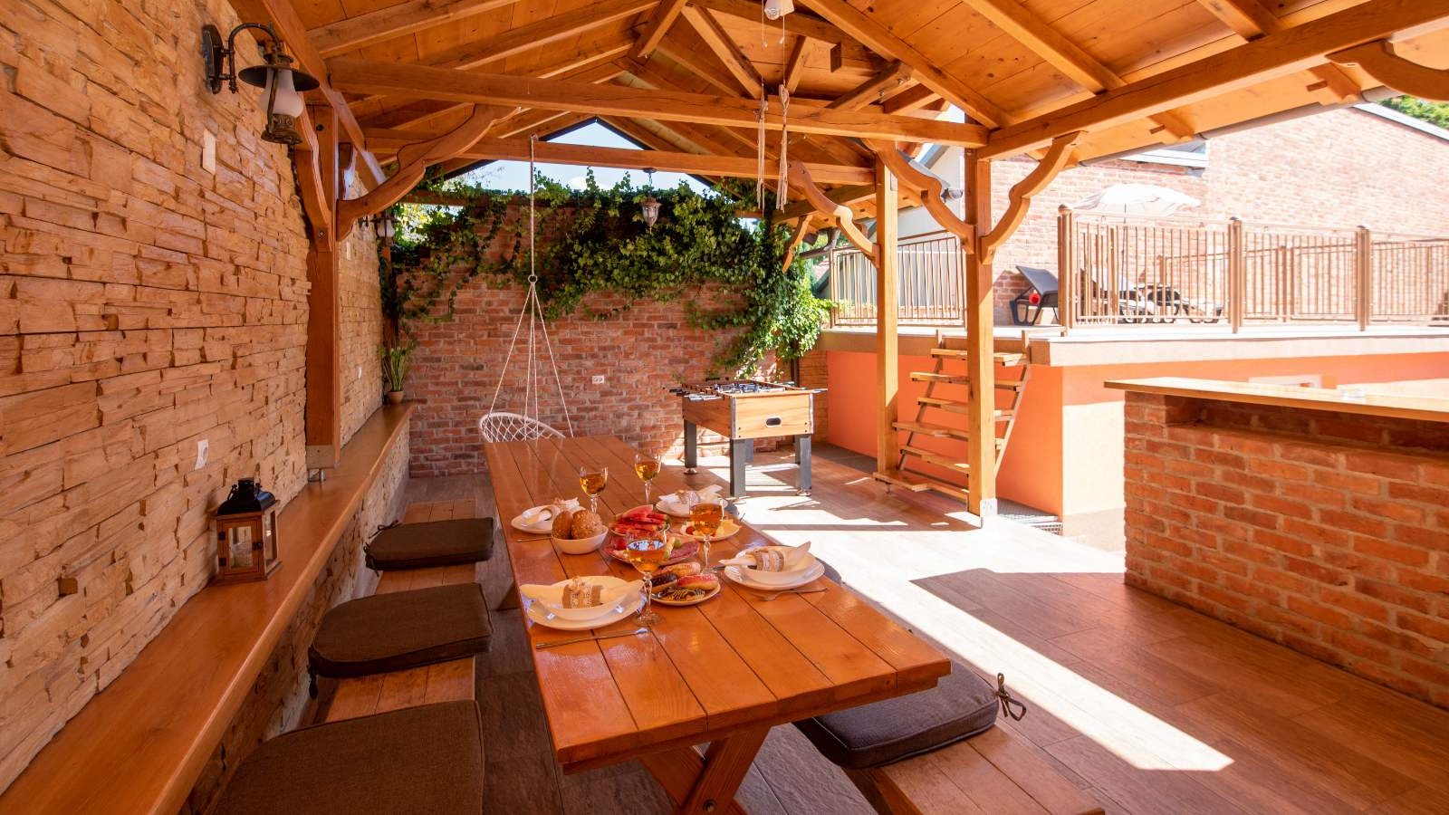 Kuća sadrži jacuzzi, natkrivenu terasu za druženje, pečenjaru, stolni nogomet, te terasu za sunčanje.
